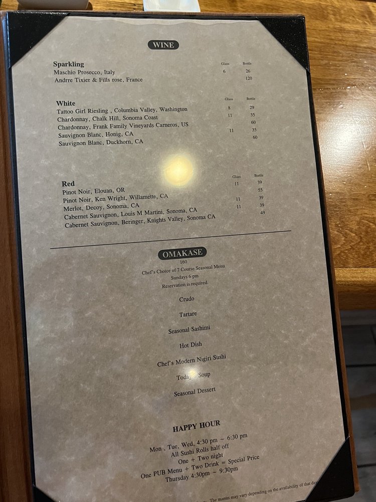 Happy hour all sushi rolls half off 1 2 night 1 pub menu 2 drinks special price.